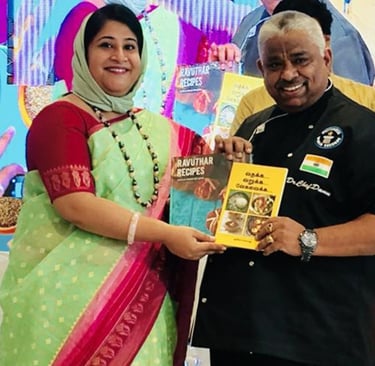 This photograph captures a truly unforgettable highlight — the moment the Ravuthar Recipes book was shared with Chef Damu, one of India’s most celebrated culinary icons.